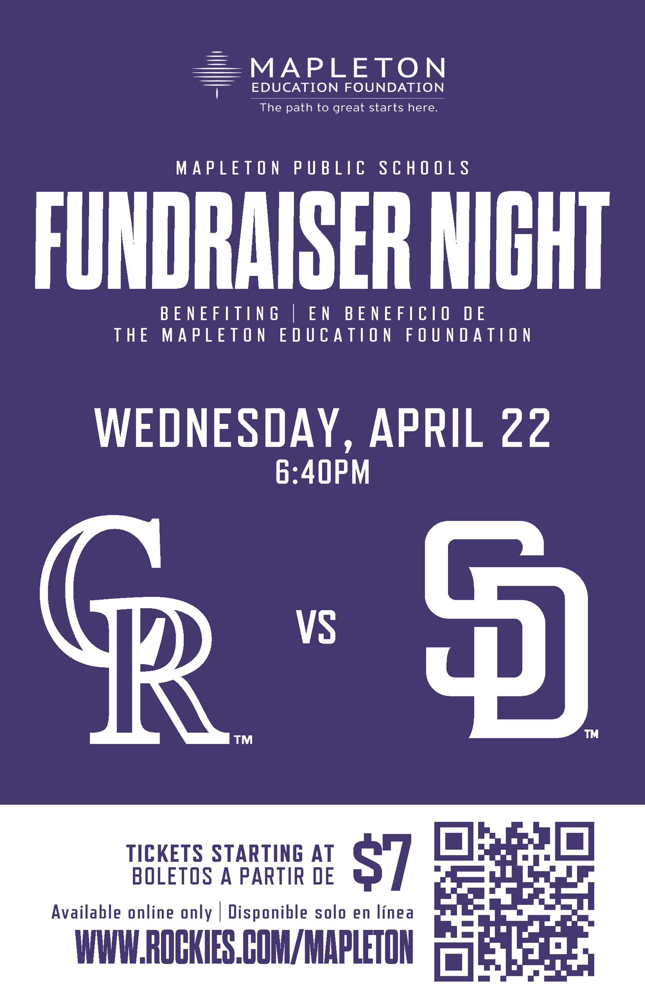 Join the Mapleton Education Foundation at Coors Field! Specially discounted tickets are available to Mapleton Public Schools students, staff, and their families. A portion of proceeds benefit the Mapleton Education Foundation. Enjoy a night at the ballpark while supporting your community!