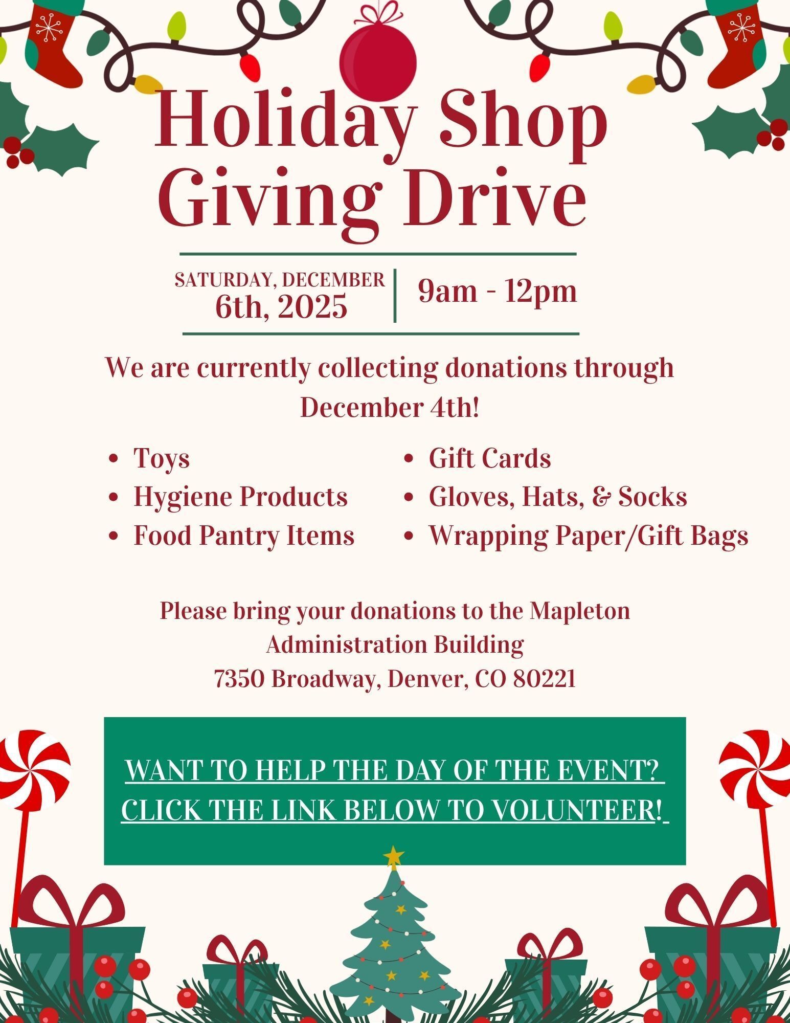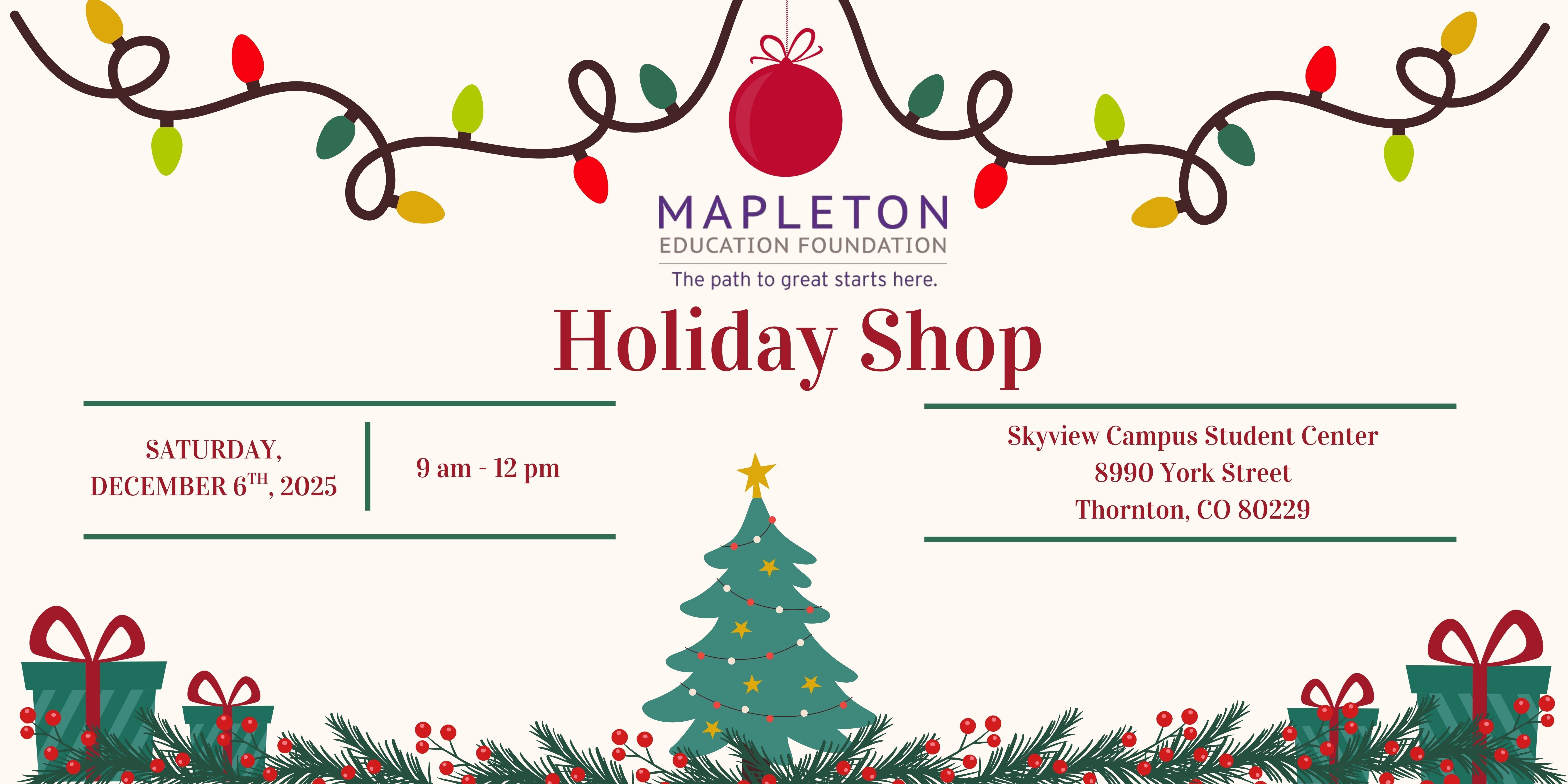 The Mapleton Holiday Shop is a joyful tradition that brings our community together to celebrate the season. On December 6th, the Skyview Student Center will transform into a festive, welcoming space where eligible families can choose gifts, winter gear, and seasonal items to enjoy with their children.